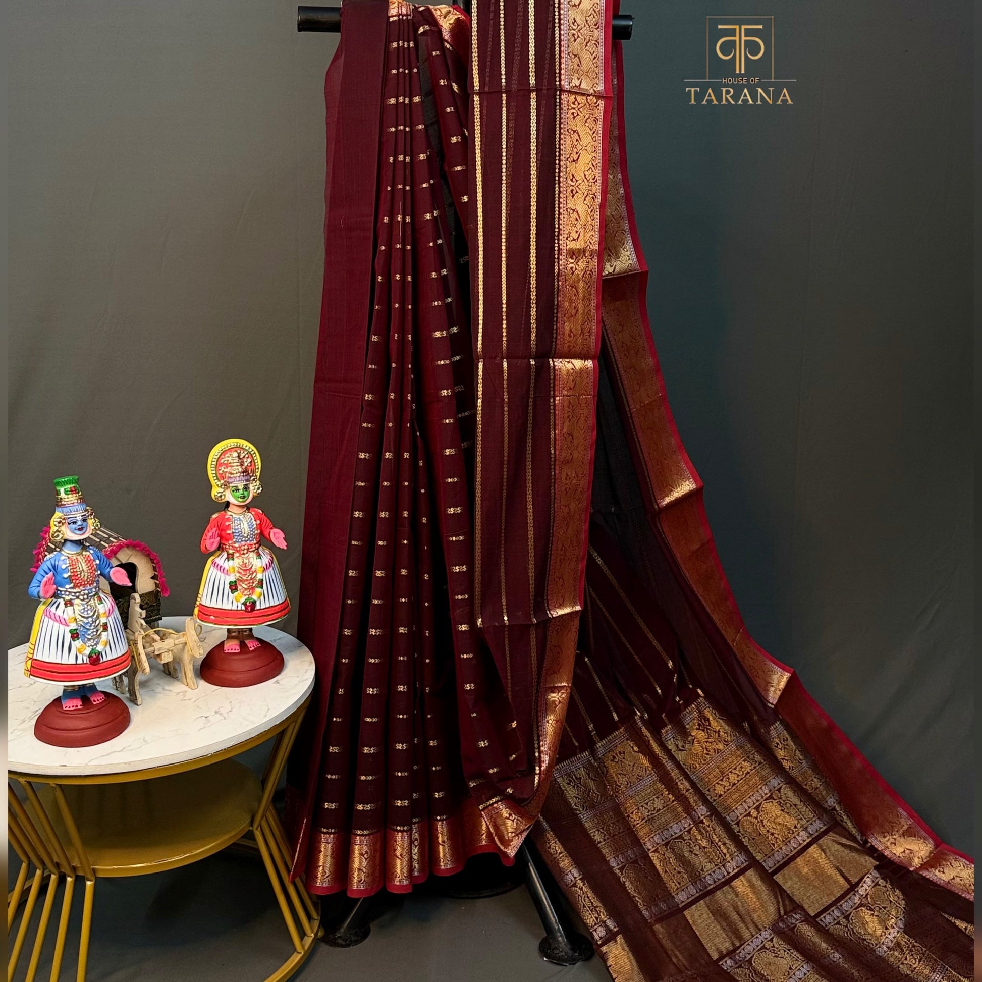 Pure Handloom more of Silk & less of Cotton (60:40) ratio. This deep maroon silk cotton features a horizontal Veldhari body with a yali-designed border. The pallu showcases intricate yali, peacocks, rudraksha, and floral motifs, blending tradition with elegance.