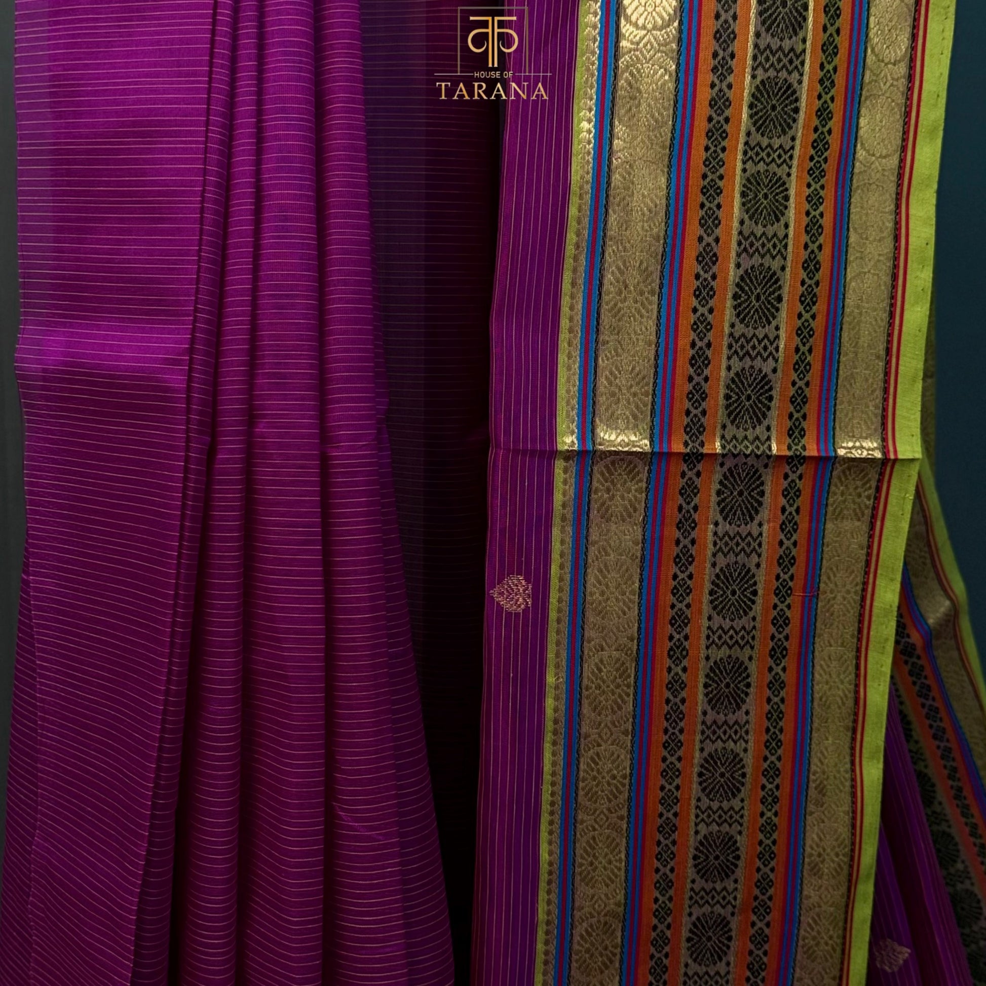 Pure Handloom more of Silk & less of Cotton (60:40) ratio. Exquisite Handloom Saree with a body of horizontal stripes and butta, complemented by a border of three rows of Laddu Kamalam. The stunning floral and Kamalam pallu makes this a luxurious, traditional must-have.