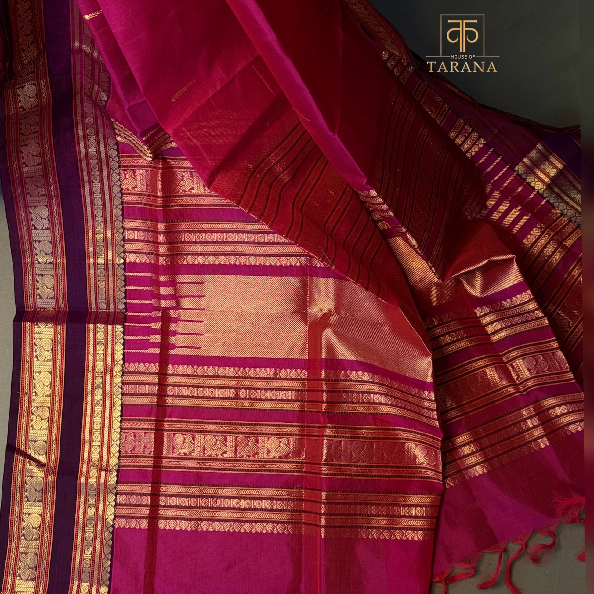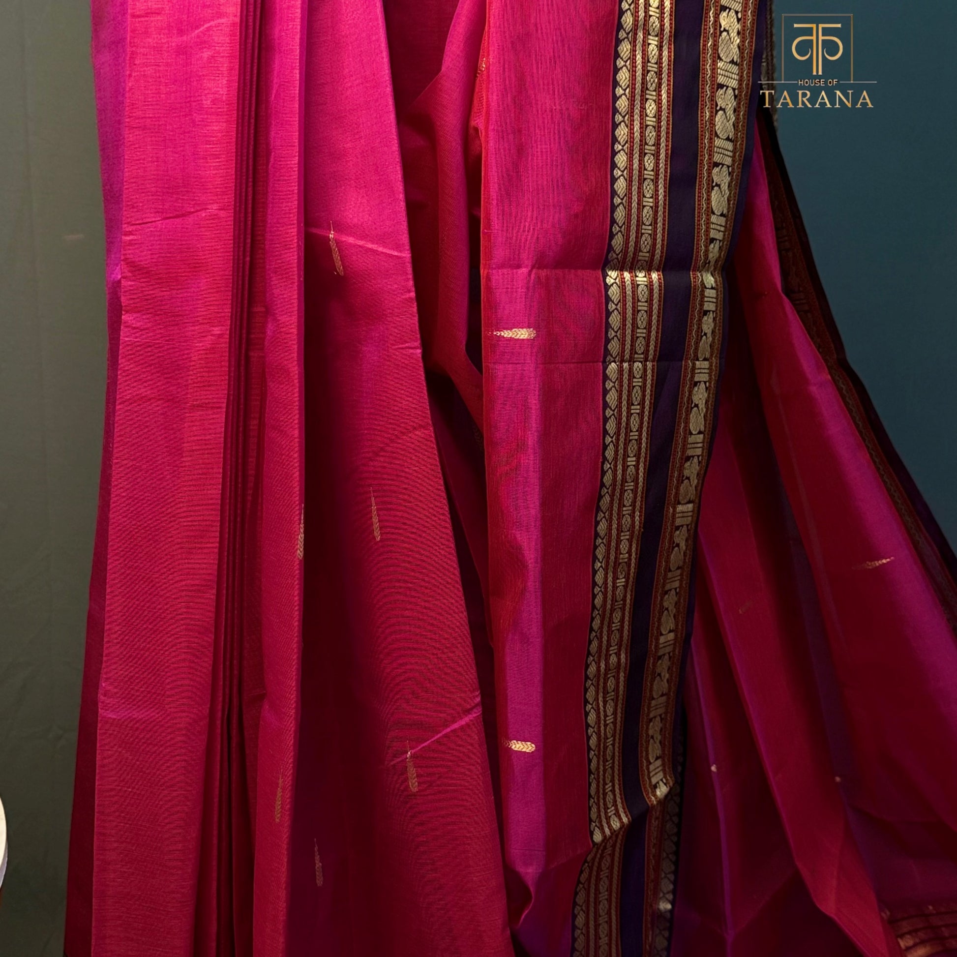 Pure Handloom more of Silk & less of Cotton (60:40) ratio. Elevate your style with the Deep Rani pink silk cotton saree, featuring a raindrop body and a purple border woven with detailed rudraksha and peacock motifs. The rich pallu highlights exquisite gold zari work, perfect for traditional and festive occasions.
