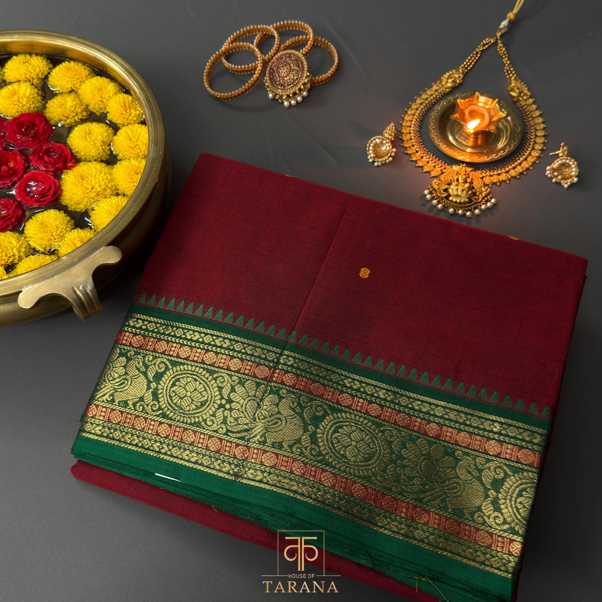 This elegant Kanchi Cotton saree in deep maroon features delicate thread motifs and a rich emerald green border with intricate gold zari floral and paisley designs. Ideal for festivals, temple visits, and cultural events, it offers the perfect blend of cotton comfort and traditional craftsmanship.