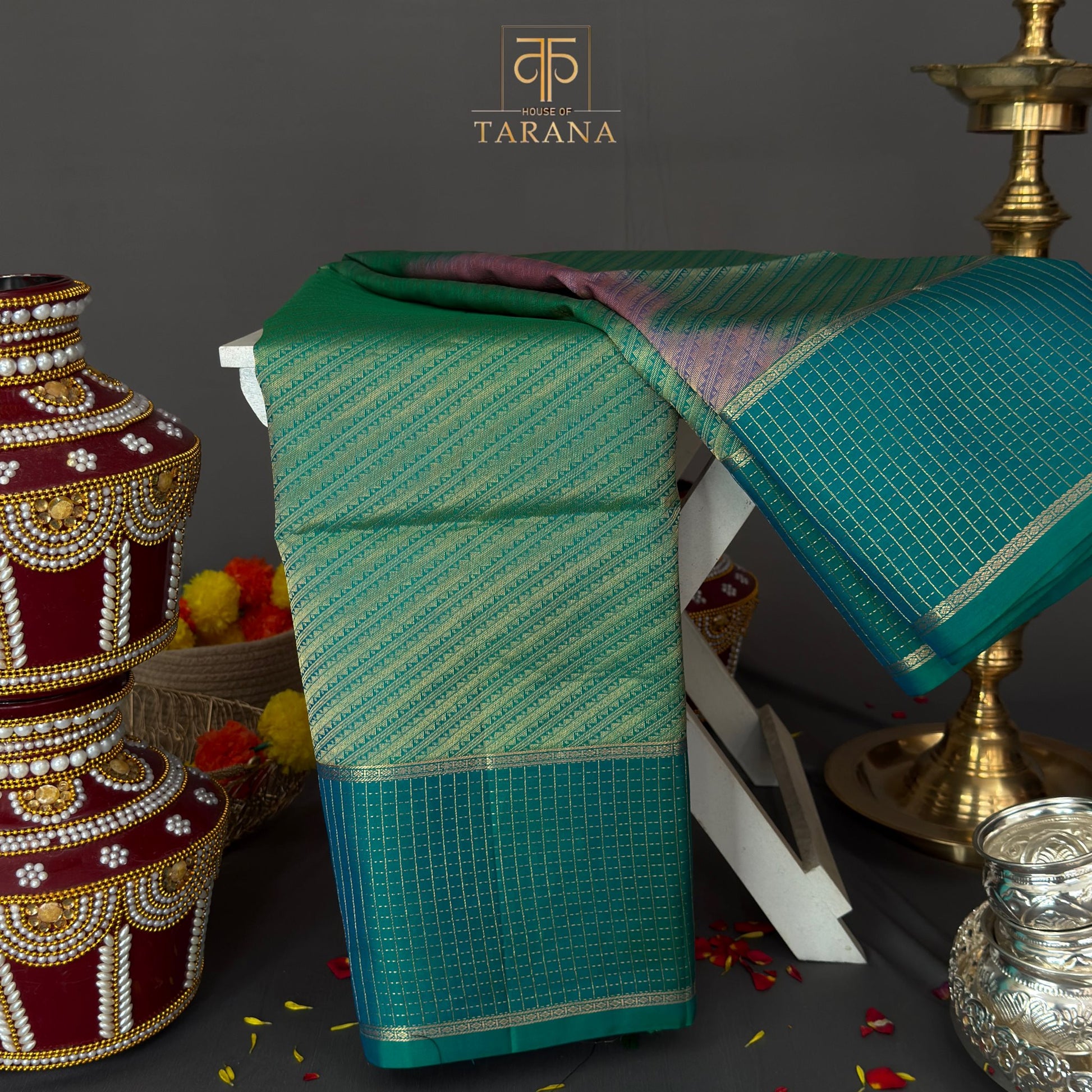 This saree displays a vibrant pink body paired with a rich teal green border featuring delicate golden checks in detailed zari work. The teal green pallu, adorned with intricate zari patterns, creates an elegant contrast enhancing its regal appeal.