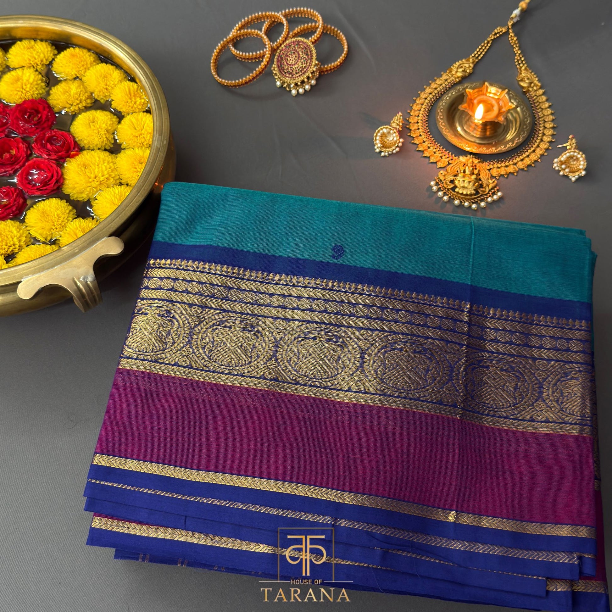 This elegant Kanchi Cotton saree features a mesmerizing peacock blue base with delicate woven motifs and a royal blue-magenta border embellished with intricate gold zari. Ideal for festive events and cultural celebrations, it combines vibrant colors with timeless craftsmanship.