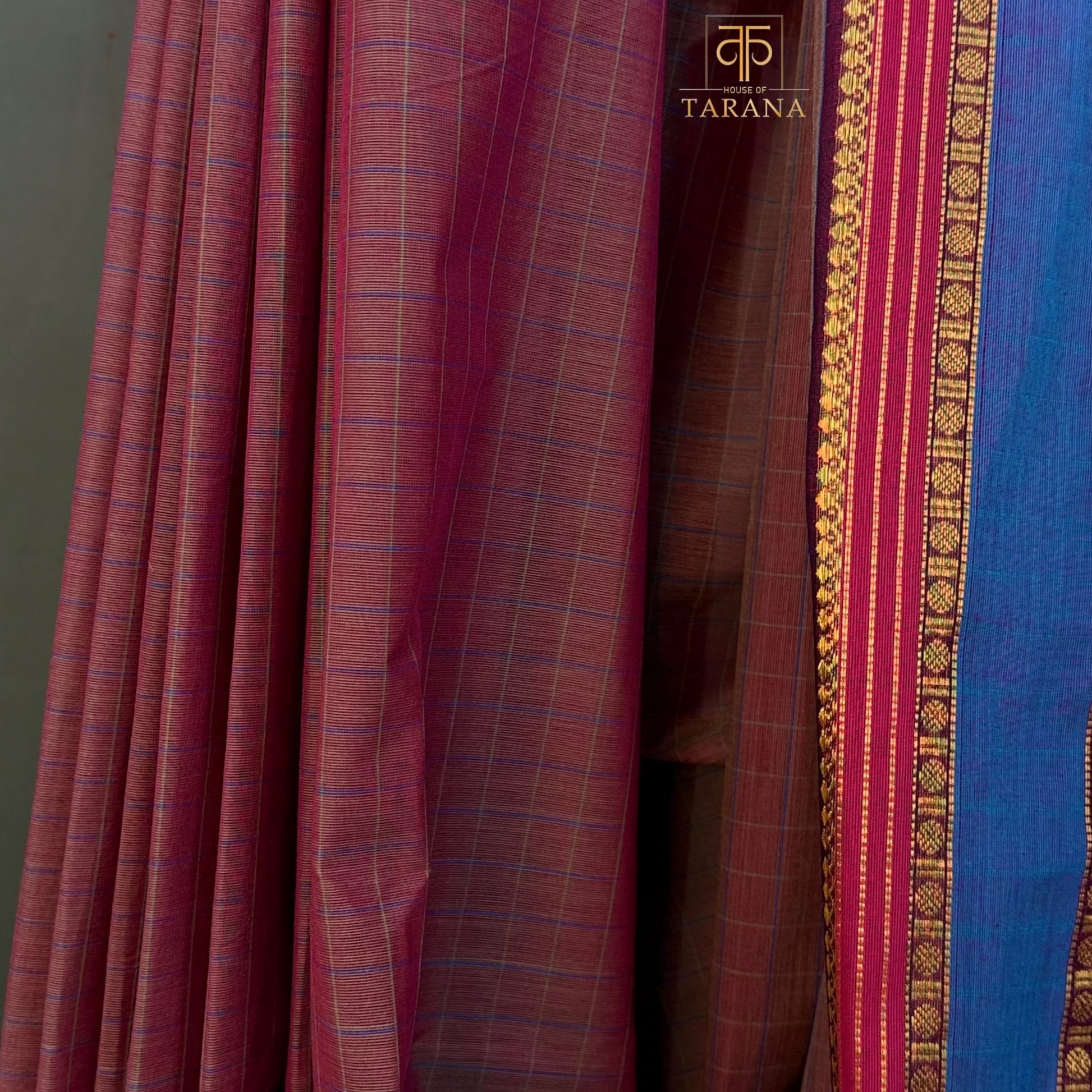 This reddish brown Chettinad cotton saree features a checked body with small butta designs and a border embellished with rudraksha patterns, peacock motifs, and horizontal stripes. A perfect blend of traditional elegance and detailed craftsmanship for ethnic occasions.